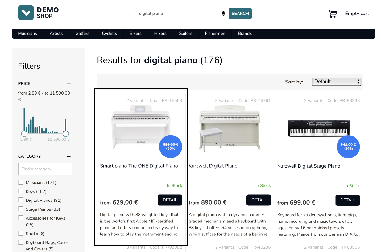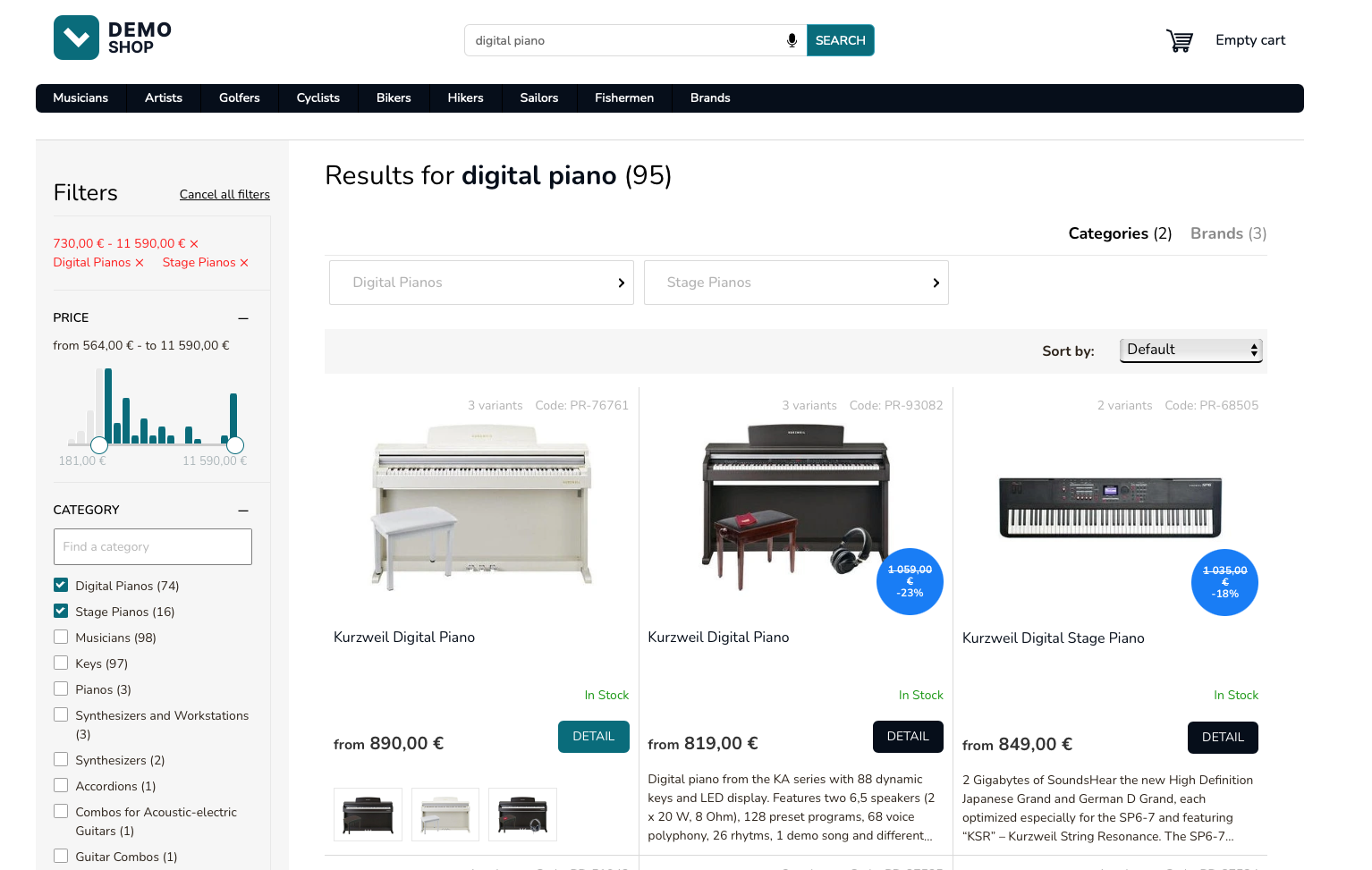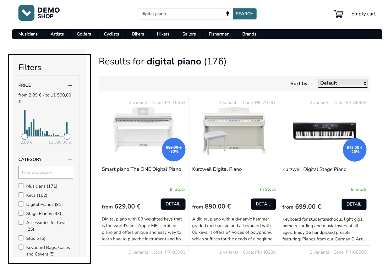 f[]parameters which indicate the selected filter. This specific combination will be interpreted as (category: Stage Pianos OR Digital Pianos) AND (price_amount within 730 - 11590).