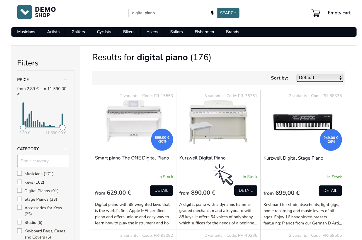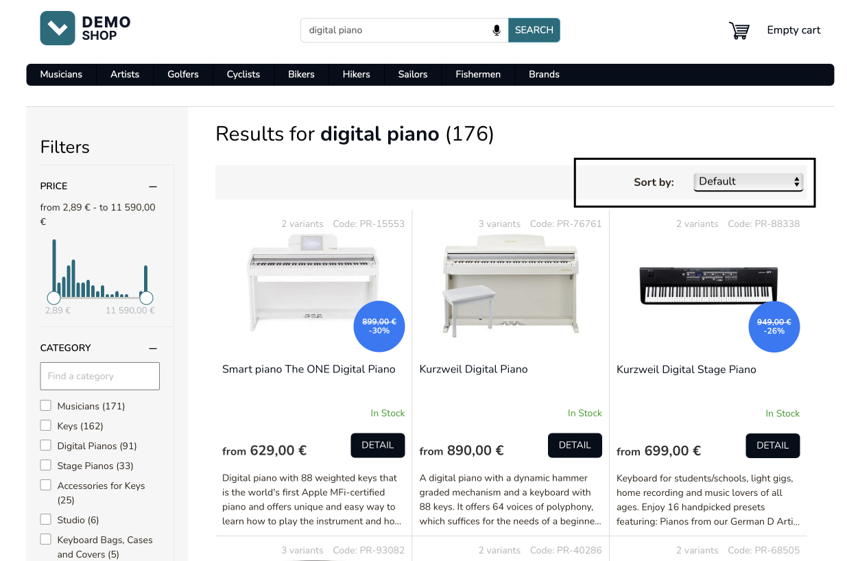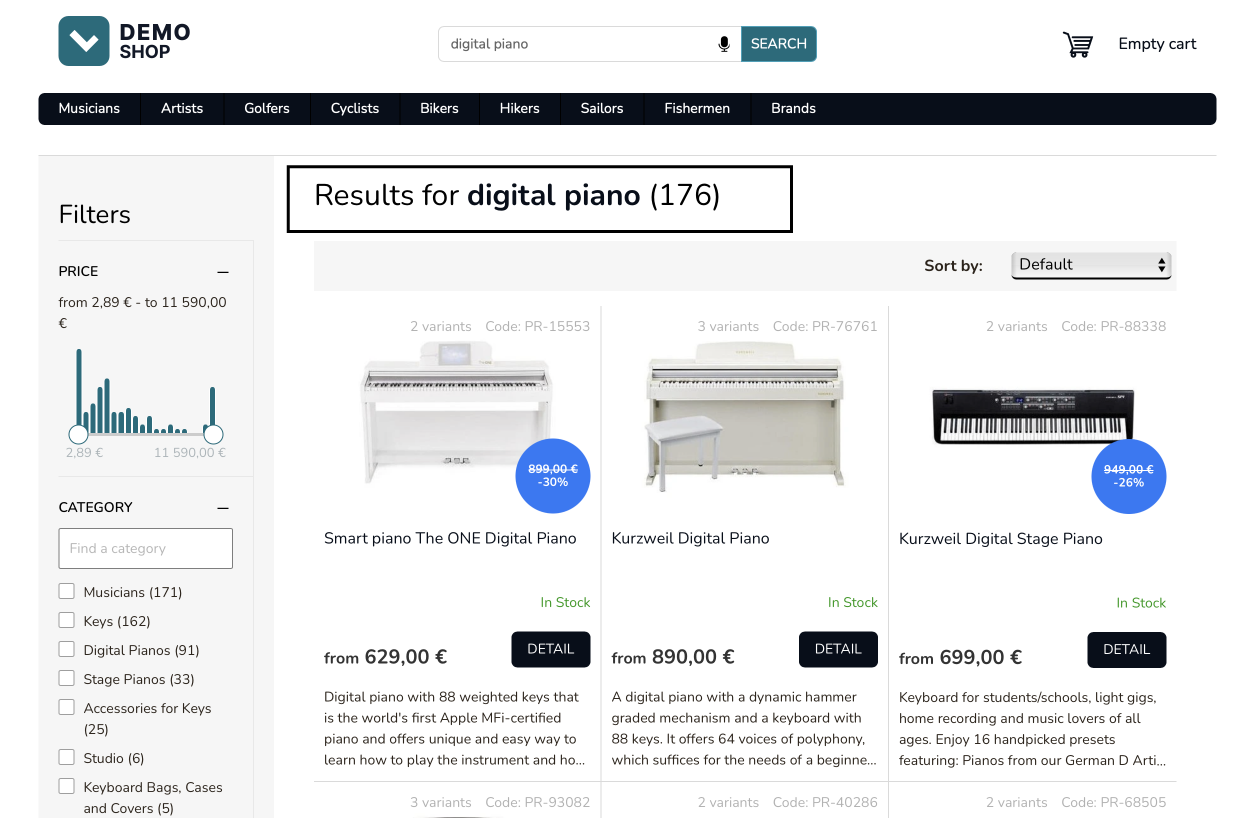 f[]parameters which indicate the selected filter. This specific combination will be interpreted as (category: Stage Pianos OR Digital Pianos) AND (price_amount within 730 - 11590).